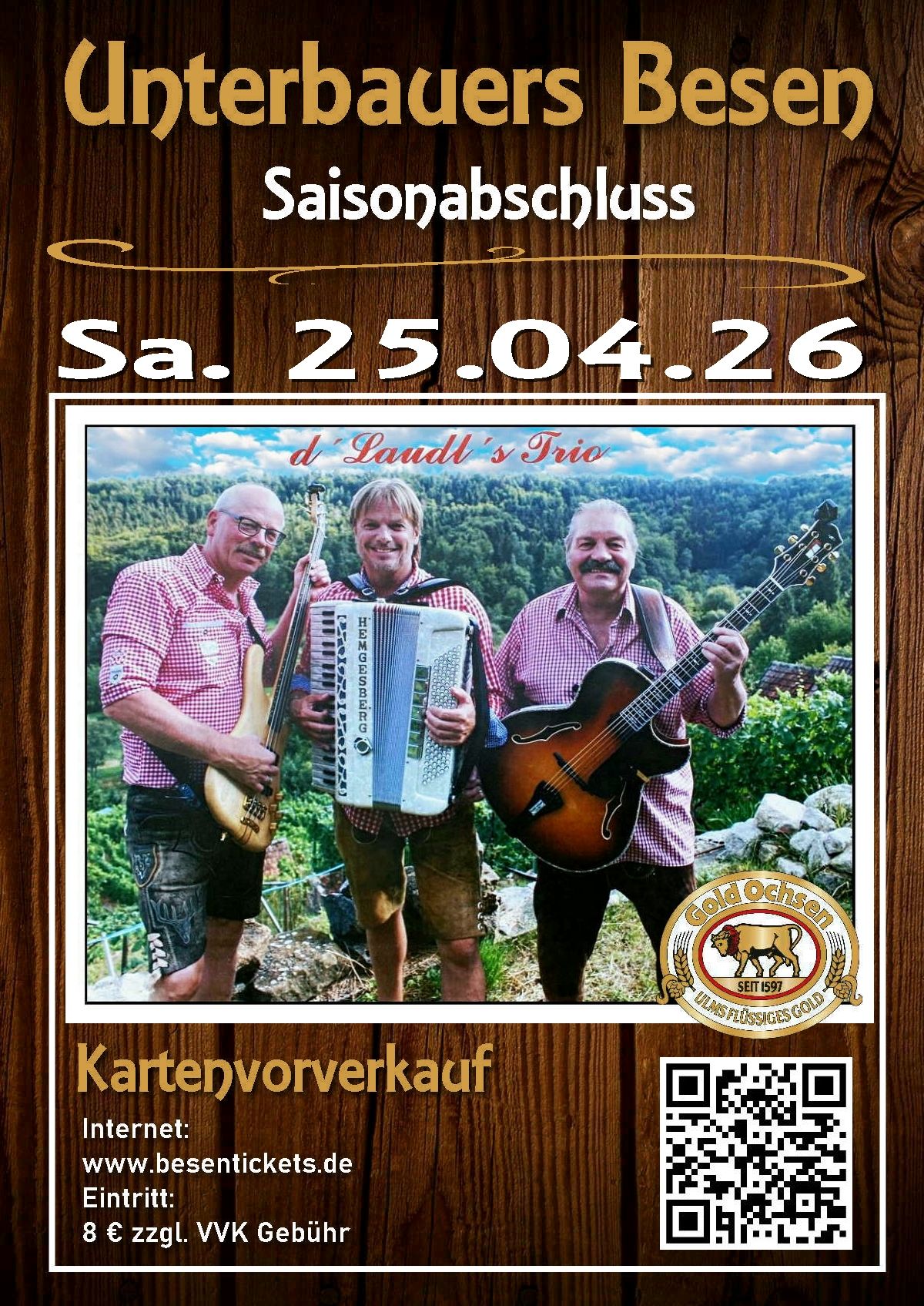 Karten online kaufen. Vorverkauf vom 20.01.2026 bis 23.04.2026 Tickets für d´Laudl´s Trio | Saisonabschluss |Stimmungsabend im BesenUnterbauer´s Besen in 73312 WaldhausenEinlass 16:00 Uhr